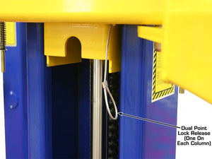The Atlas® 9KBP features dual hydraulic chain-drive cylinders, symmetric arms, and automatic arm restraints. Atlas® 9KBP two post “chain over roller” lifts have a spring-loaded Secondary Lock System (SLS) that automatically engages in the event of a slack or broken chain.