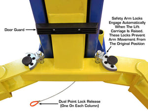 The Atlas® 9KOH two post “chain over roller” lifts have a spring loaded Secondary Lock System (SLS) that automatically engages in the event of a slack or broken chain.