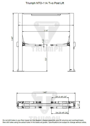The Triumph Clear Floor NTO-11A, 11,000 LB Capacity 2-Post auto lift has 3-stage telescoping arm design that gives you more versatile arm positioning. Single-piece columns for added strength to support your vehicle. Single-point safety release adds efficiency and safer to use. Direct-Drive Cylinders, that have fewer moving parts then chain over cylinder lifting style. This commercial grade auto lift with 118" between posts and 108" drive thru makes this the perfect lift for fleet and automotive service shops.