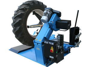 This Atlas® TTC 306 truck tire changer is designed for high volume truck, agricultural and mine truck tire shops that demand dependability and durability in their equipment. The remote-controlled disc roller and demount hook allow the operator to mount or demount a tire from the remote-control pedestal.