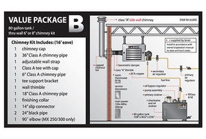 XT150 Includes: Heater with 80-gallon tank and thru wall 6" chimney kit