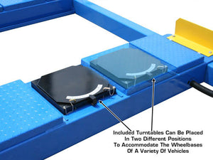 The Atlas® 412A 12,000-pound capacity four post lifts are designed and built to commercial grade standards and will provide many years of service. Our Atlas® alignment lifts offer many exclusive features not found on many other competitor’s lifts. Each Atlas® 412A alignment lift includes a set of front turntables. The turntables can be set in different positions on the runway to accommodate a wide variety of wheelbases. The slip plates are built into the runways and are level with the front turntables. There are included metal cover plates (that cover the cut-outs for the turntables) so that the vehicle is not sitting on the turntable if the lift is not being used for alignment.