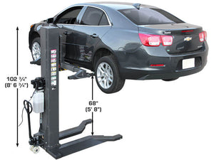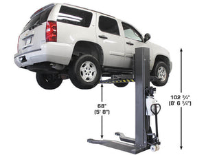 The Atlas PSP-6000 column is equipped with the chain break mechanism that automatically locks the carriage into place in the unlikely event of a chain failure. The Portable Single Post Lift rolls easily on a level concrete surface and can be used either inside or outside of your garage. The column fits under a 9-foot (108 inch) ceiling and allows the operator to raise most vehicles high enough to access many parts of the vehicle that would not be accessible with a mid-rise lift.
