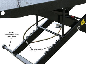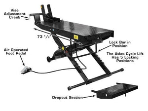 The Atlas® Cycle Lift is the perfect addition any service department of professional motorcycle dealers or is a great motorcycle lift for the person who wants to work on his personal bike in his own garage. This is a complete motorcycle lift that includes an adjustable front (padded) wheel vise and a heavy duty air operated foot valve for easy raising and lowering. The stabilizing bar is included at no extra charge. This bar provides greater stability for the raised platform by increasing the “footprint” of the lift. Many companies do not include this very important stabilizing bar in their “lift package”.