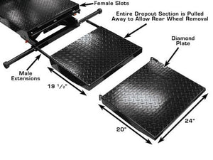 For those customers who need an even longer platform, the Atlas® Cycle Lift can be equipped with the Atlas® Chopper Extension. The Atlas® Chopper Extension adds 13" to your lift table platform, making the total length 106". The Atlas® Cycle Lift equipped with the Atlas® Chopper Extension is one of the longest motorcycle lifts on the market.