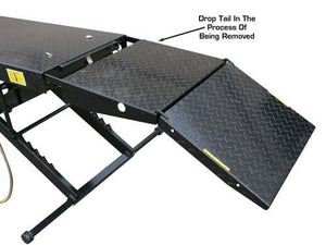 The Atlas® Cycle Lift motorcycle lift has a 19 1/2" removable rear section. This 19 1/2" section can be easily removed so that a rear tire can be can easily be "dropped straight down" from the rear axle. Since the entire platform width is removed, any sized rim can be lowered from the axle.