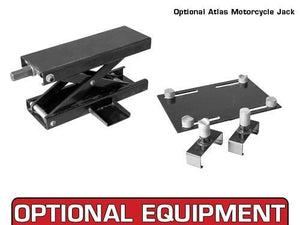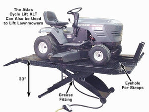 The Atlas® Cycle Lift XLT ATV and golf cart air operated lift is the Atlas® Cycle Lift that has been equipped with the Atlas® Cycle Lift XLT kit. The Atlas® Cycle Lift XLT kit consists of two removable 93" X 12" diamond plated side extensions, two removable 12" X 20" diamond plated approach ramps, three cross tubes with lock rings, and a wheeled dolly.