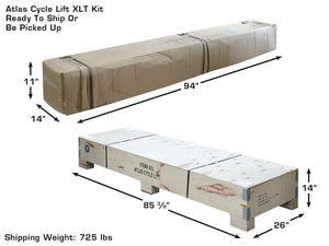 When the Atlas® Cycle Lift XLT kit is attached (this takes about three minutes), to the Atlas® Cycle Lift, the lift is transformed into the Atlas® Cycle Lift XLT. When the XLT kit is attached to the Atlas® Cycle Lift, the raised platform area is 93" X 48" and the approach ramps are 20" X 48"
