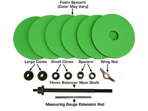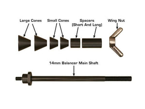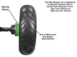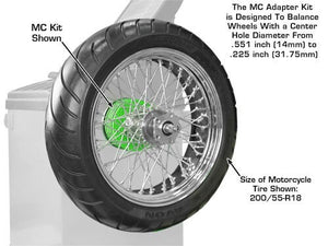 The Atlas® MC adapter kit will allow your Atlas® (passenger and light truck) computer wheel balancer to balance a variety of motorcycle wheels with hub assemblies up to 9.25 inches wide. The Atlas® MC adapter kit quickly installs in all Atlas® (passenger and light truck) computer wheel balancers. A simple sixty second procedure will transform your Atlas® (passenger and light truck) computer wheel balancer into a state of the art motorcycle wheel balancer. The MC adapter kit is designed to balance wheels with a center hole diameter from .551 inch (14MM) to 1.25 inch (31.75MM). Although the MC Kit will accommodate wheels with a center hole larger than 1.00 inch, the weight and the width of the complete wheel assembly may require the use of our MC-XLT adapter set.