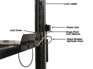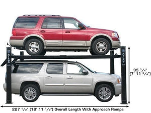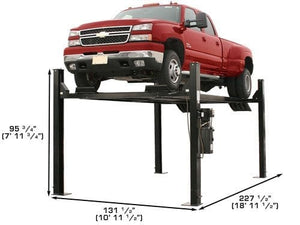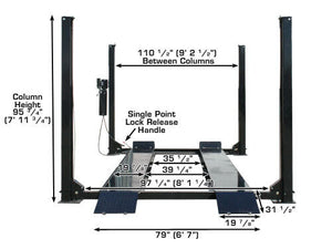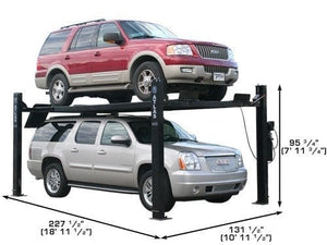 The Garage Pro 9000 can lift your pick-up truck or car up to 85 inches in the air. This above ground lift is the perfect choice for parking taller vehicles under your stored vehicle. The commercial grade features of the Garage Pro 9000 make this lift the perfect choice for automotive service center or Mr. Homeowner that needs a PORTABLE professional four post lift at a competitive price. The Garage Pro 9000 four post lift comes standard with a powerful 110-volt power unit. A 30-amp breaker is required.
