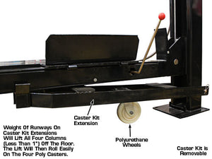 This Atlas® Garage Pro 9000 4 post lift can accommodate a 187" vehicle. The Atlas® Garage Pro 9000 has the longest runways (we believe) of any portable 9,000 LB. four post on the market. The Atlas® Garage Pro 9000 weighs about 300 LB. more than our Atlas® Garage Pro 8000. The Atlas® Garage Pro 9000 4-post above ground lift incorporates many features that are not found in any of our competitors' four post lifts that are sold in the USA. This lift is a portable four post lift incorporating polyurethane casters on the caster kit to prevent damage to the garage floor.