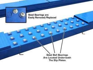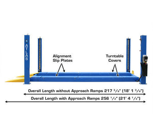 The Atlas® 414A 14,000-pound capacity four post lifts are designed and built to commercial grade standards and will provide many years of service. Our Atlas® alignment lifts offer many exclusive features not found on many other competitor’s lifts. Each Atlas® 414A alignment lift includes a set of front turntables. The turntables can be set in different positions on the runway to accommodate a wide variety of wheelbases. There is also a FREE airline kit ($300 value) included when you purchase the “combo package” (2-rolling jacks). The slip plates are built into the runways and are level with the front turntables. There are included metal cover plates (that cover the cut-outs for the turntables) so that the vehicle is not sitting on the turntable if the lift is not being used for alignment.